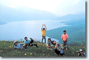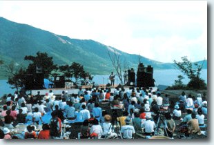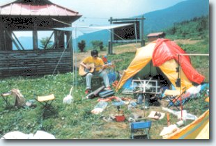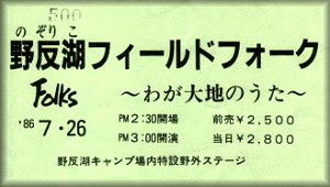 初めてこの景色を見たときは本当に感動した ノゾリキスゲは一日で散ってしまうという次から次へと咲き乱れる自然の豊かさよ このチラシがコンサートを知ったきっかけ赤木一孝・坂庭賢享・笠木透・進藤了彦・安達元彦 雄大な景色に響く歌声が心地よい気持ち良いから昼寝するのも勝手 いちおうタープは張ったが青空の下で車座に座ってしまった 大物グッズは無いが数だけは…よくぞ運んだものだ
